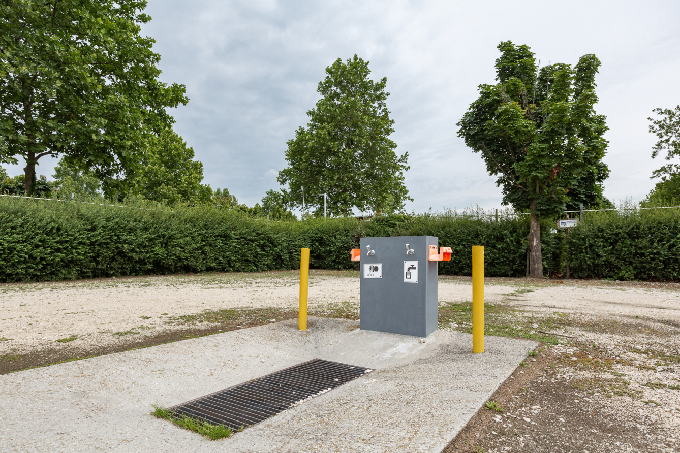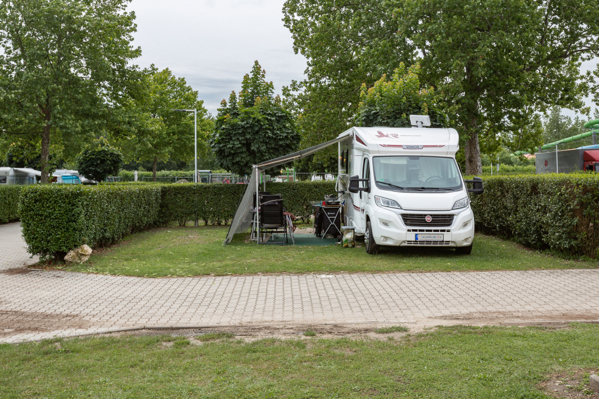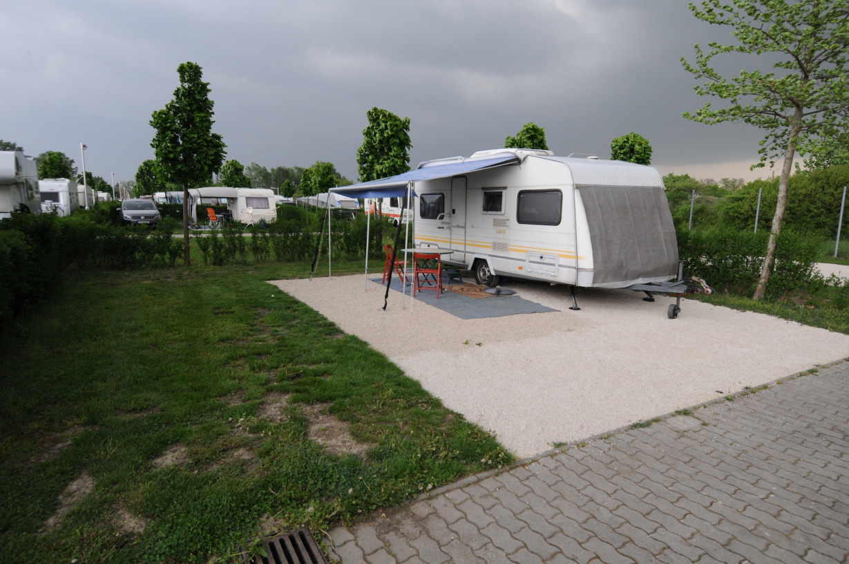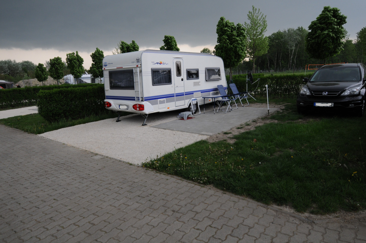 Auf der Parzelle ist eine Fläche von ca. 6,00 x 4,00 m mit einer Kiesschüttung für das Aufstellen von Vorzelt / Sonnensegel angelegt. Die restlichen 76qm sind Rasenfläche.