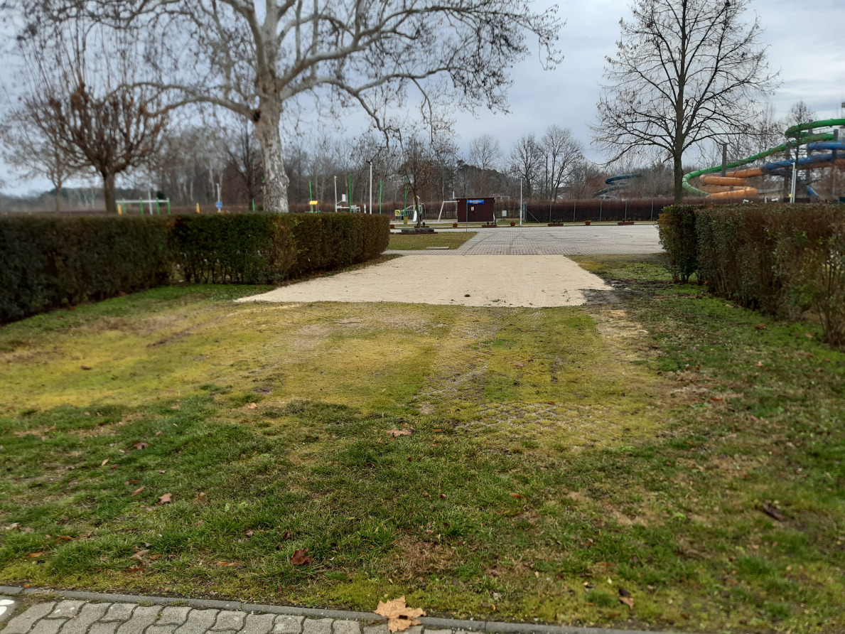 Auf dieser Parzelle sind ca. 12,5qm (5,00 x 2,50 m) Verbundsteinpflasterfläche für das Aufstellen von von Vorzelt / Sonnensegel verlegt. Der Rest ( ca. 87,5qm) ist Rasenfläche.
